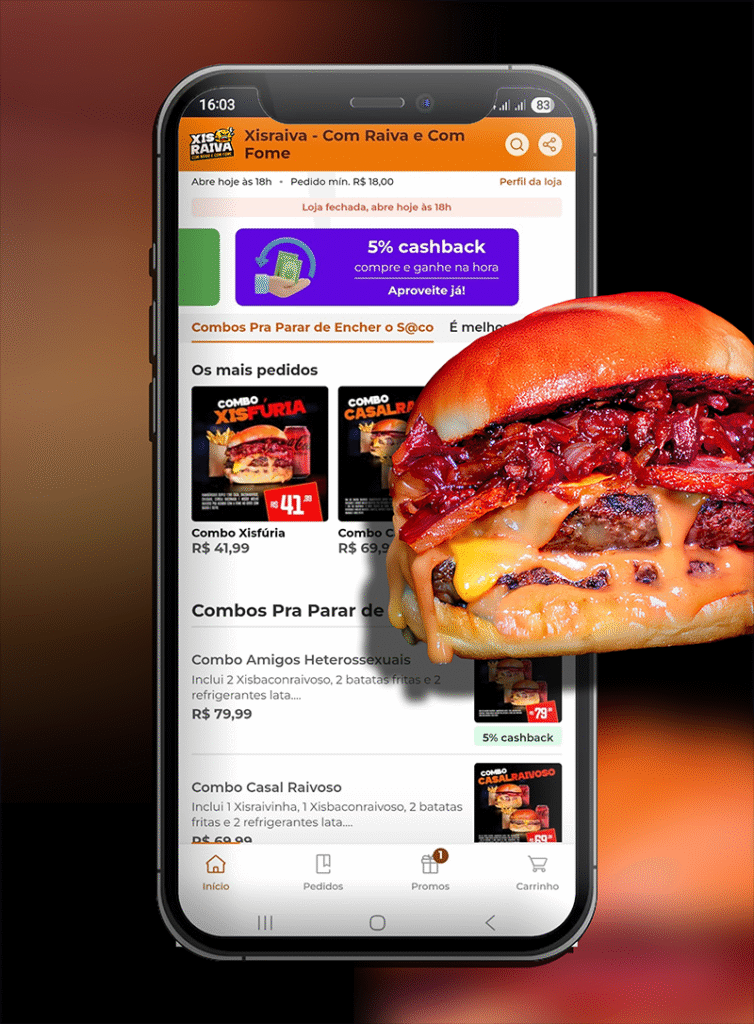 Inclui 1 Xisraivinha, 1 Xisbaconraivoso, 2 batatas fritas e ....